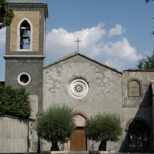 La facciata della chiesa è caratterizzata da un rosone, mentre il campanile quadrato è in pietra lavica. Sul fianco destro si apre l’ingresso del convento con il chiostro.