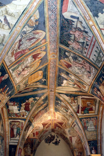 Partendo dalla prima campata, sulle vele sono dipinti la Vita e la Passione di Cristo, mentre sulle pareti sono rappresentati rispettivamente l’Inferno a destra e il Paradiso a sinistra, con Cristo in trono circondato da angeli. La seconda e terza campata trattano temi della Genesi, con Dio che separa la luce dalle tenebre, la creazione della terra, della luce, delle piante e delle stagioni. Prosegue con la creazione della donna, il peccato originale e il sacrificio di Abele. Seguono tre cicli di affreschi di epoca successiva: il ciclo cristologico di Antonello Palumbo, il ciclo della Genesi e quello dei Santi, di Nicola da Novi, con un San Francesco che riceve le stimmate.